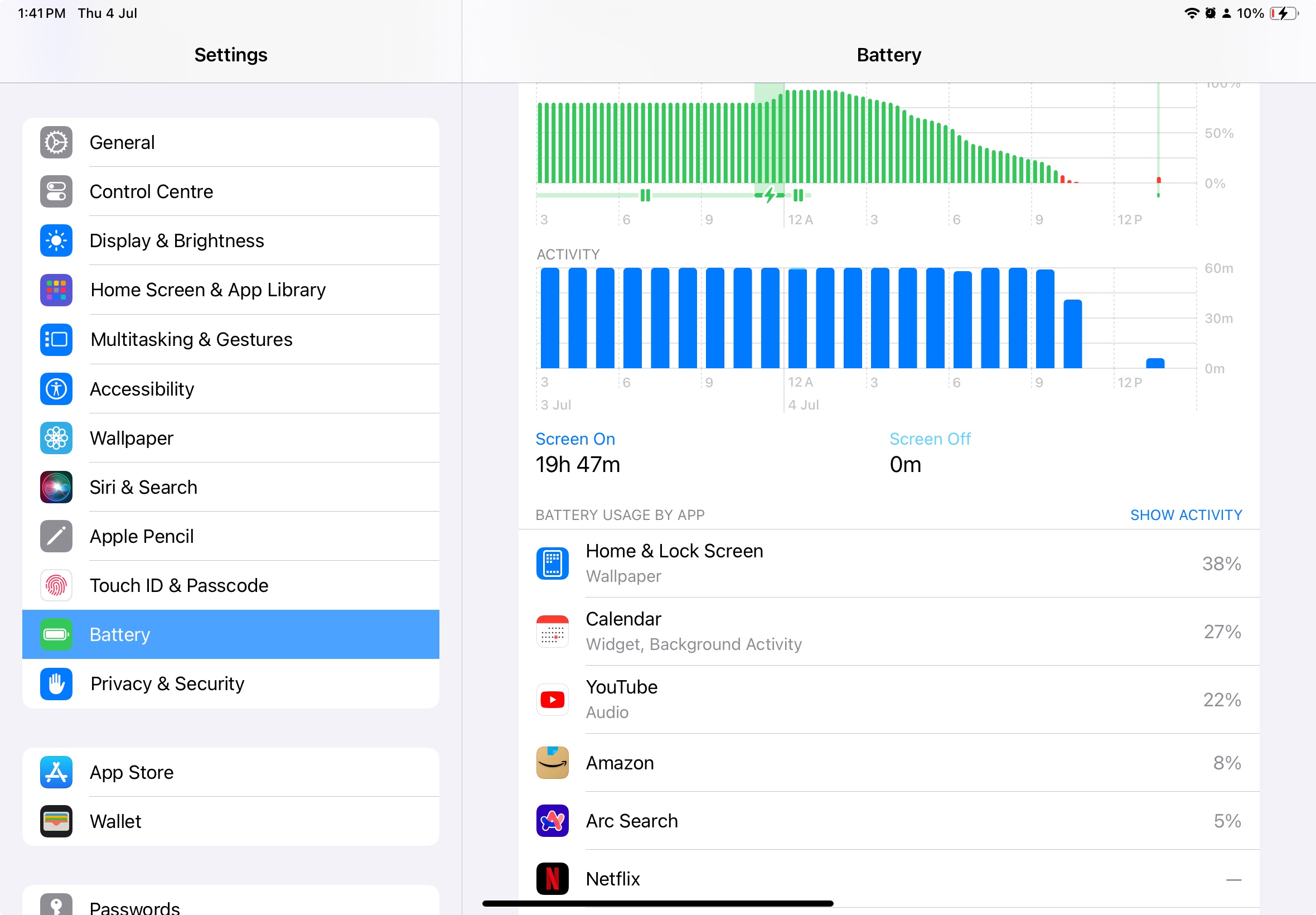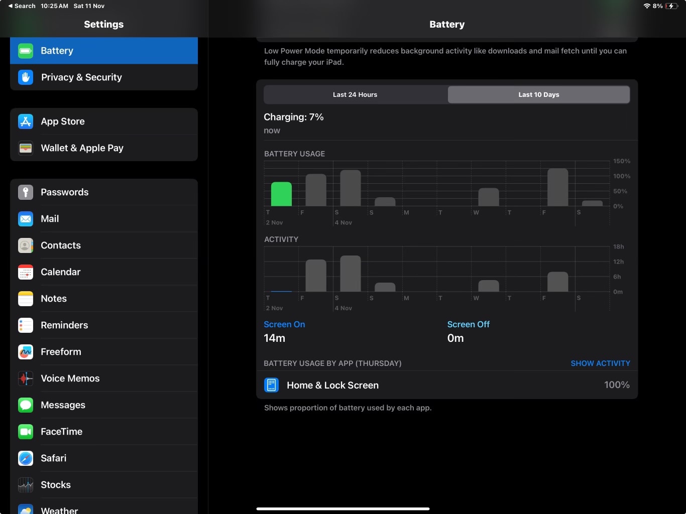 Upon investigating the issue in the settings, I noticed that the “Home & Lock Screen” is consistently listed as the culprit, consuming 100% of the battery even during periods of inactivity. This has become a recurring problem, and it’s particularly concerning given that the iPad is less than a year old.