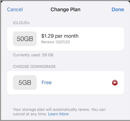 <downgrading your iCloud plan is the way to go. Note that this has a monthly fee>