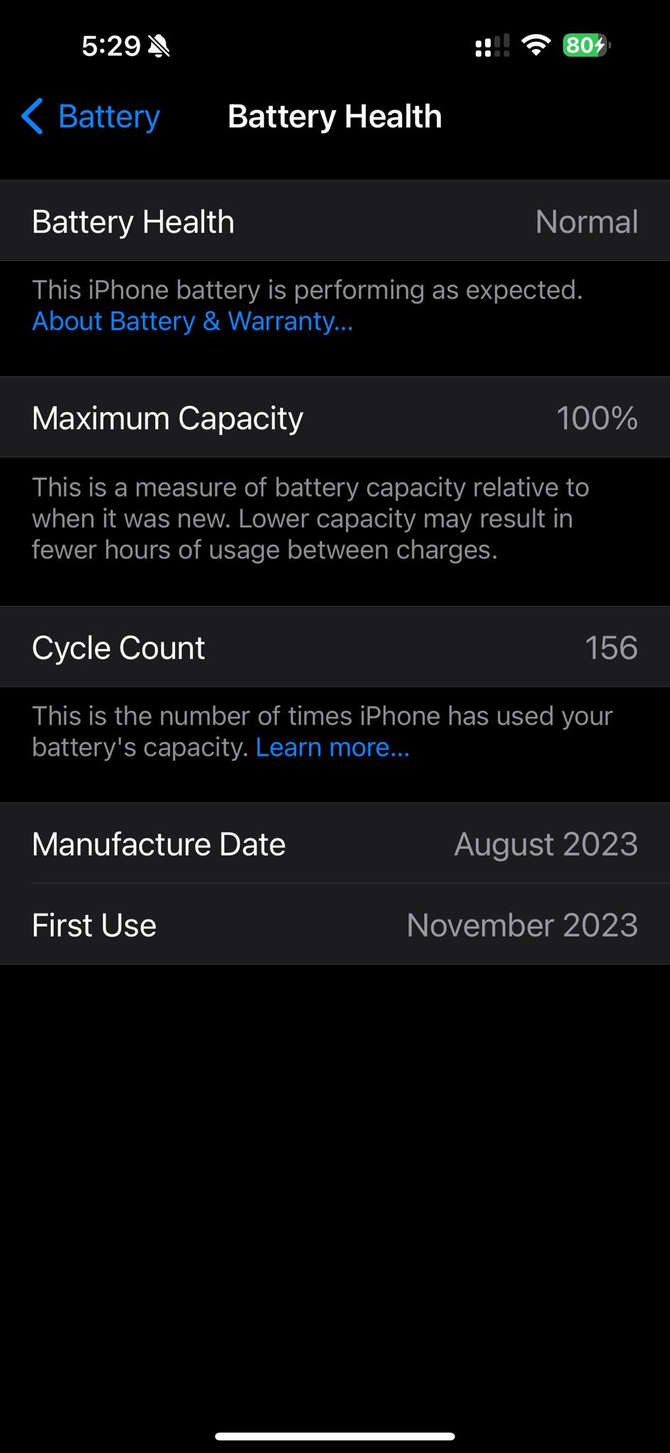 i still have 100% after 81 cycles. i think it depends on the user. id recommend only charging to 80%. you can set an 80% limit in settings on all 15 models, settings>battery>battery health & charging>charging optimization and select 80% limit. i charge my phone overnight so only charge to 100 if i really need it. the 80% limit helps so much especially charging overnight.