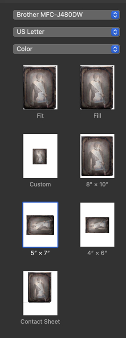If you want to print a vertical picture sideways on a piece of paper, then you can select the image and use File>Print ( ⌘-p ) and select from choices like these: