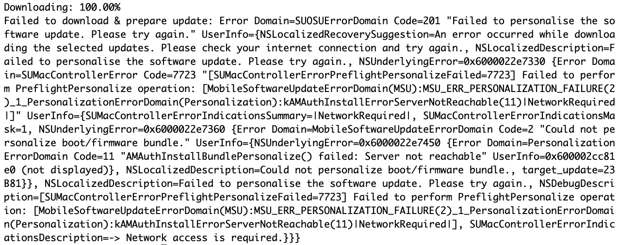 " Server not reachable" UserInfo=0×600002cc81 el (not displayed)}, NSLocalizedDescription=Could not personalize boot/firmware bundle.,"