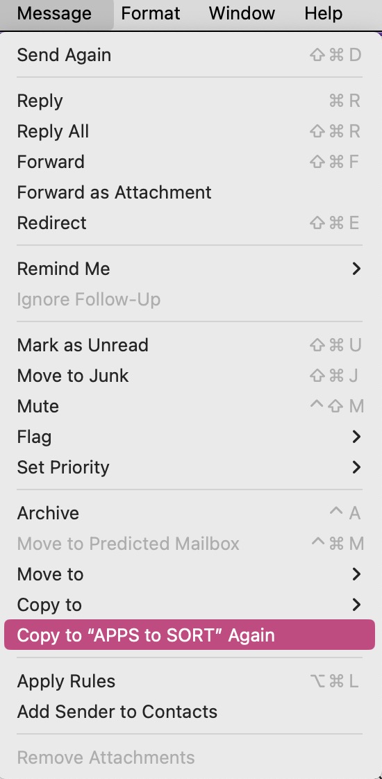 - I do not think this problem is being caused by synchronisation with Gmail, because Apple Mail itself is interpreting the command "Move to" as "Copy to". The evidence for this is, when I click on the "Message" main menu option after having followed the steps to "Move" a message, the drop-down menu displays the option to 'Copy to "APPS TO SORT" Again' - clearly indicating that Mail interpreted my last command as "Copy to"