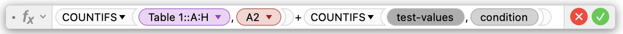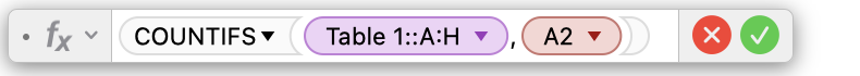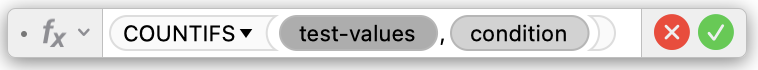 In the summary table, in cell B2, type = and select COUNTIFS from the functions selector (visible if Format is selected in the toolbar), and click on Insert Function. You'll get that: