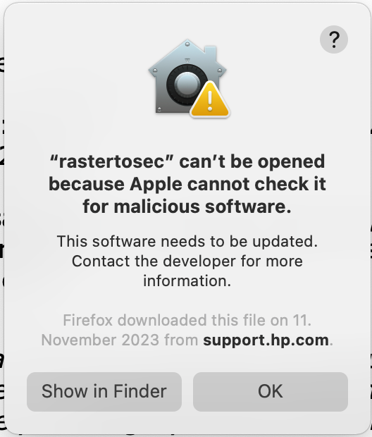 In the meantime, I also tried to print a web page, both online and after download as SingleFile (Firefox). This is blocked, too. The Mac gives the alert for 2 files named 'rastertosec' and 'prefilter'. I can manage to do the Allow Anyway trick, but it has no effect. I can't print these files.
