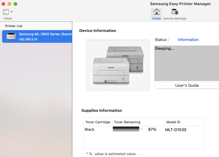 I have used a Samsung ML2955ND laser with AirPrint on Big Sur and without any Samsung drivers, and with the printer powered, I can see the amount of toner left. The Samsung Easy Printer Manager software works on Big Sur, just as it continues to work on Sonoma 14.1.1 — but you have to allow it as the developer is not recognized.