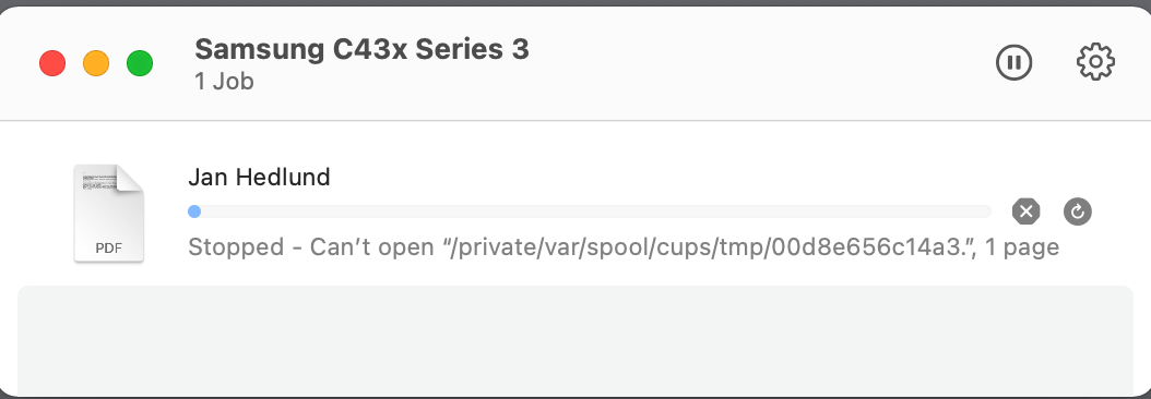 After all these trials, I find 3 printer icons in the Dock, showing numbers 10, 6 and 1. They seem to refer to print attempts and show a text 'Stopped - Can't open "/private/var/spool/cups/tmp/<a long alpha-numerical string.">'