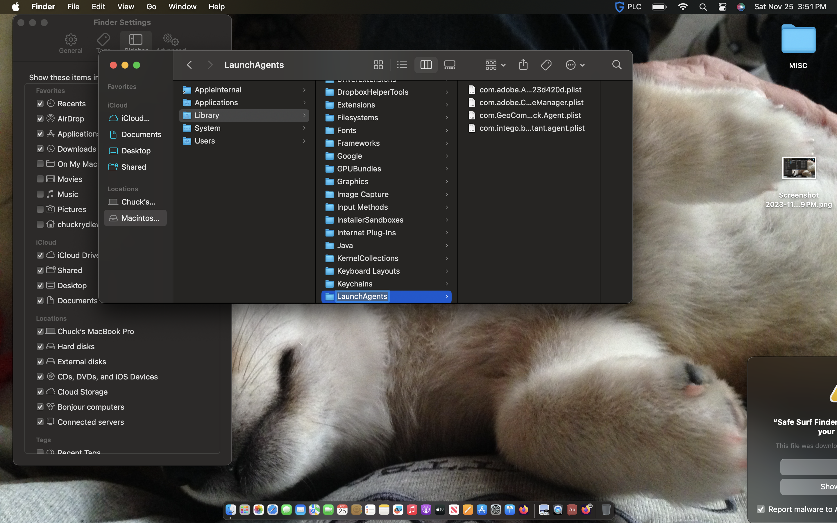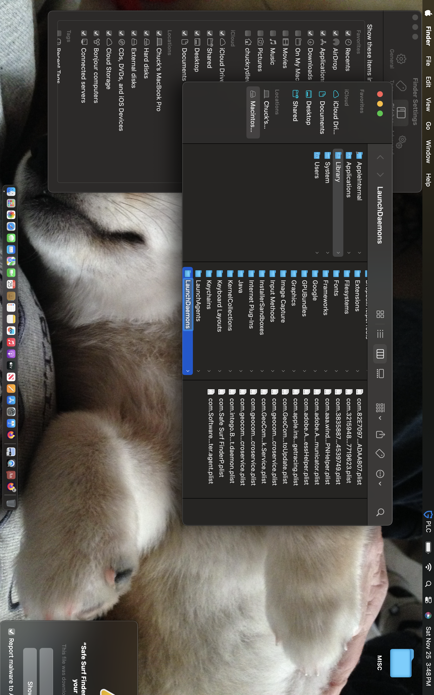 Received a warning "Safe Surf FinderDaemon" will damage your computer. The warning has two options OK and show in finder - I cannot find this anywhere on my computer to trash it. Lastly, I cannot remove the warning. Also, I cannot find "Safe Surf FinderDaemon" on the computer to remove it.