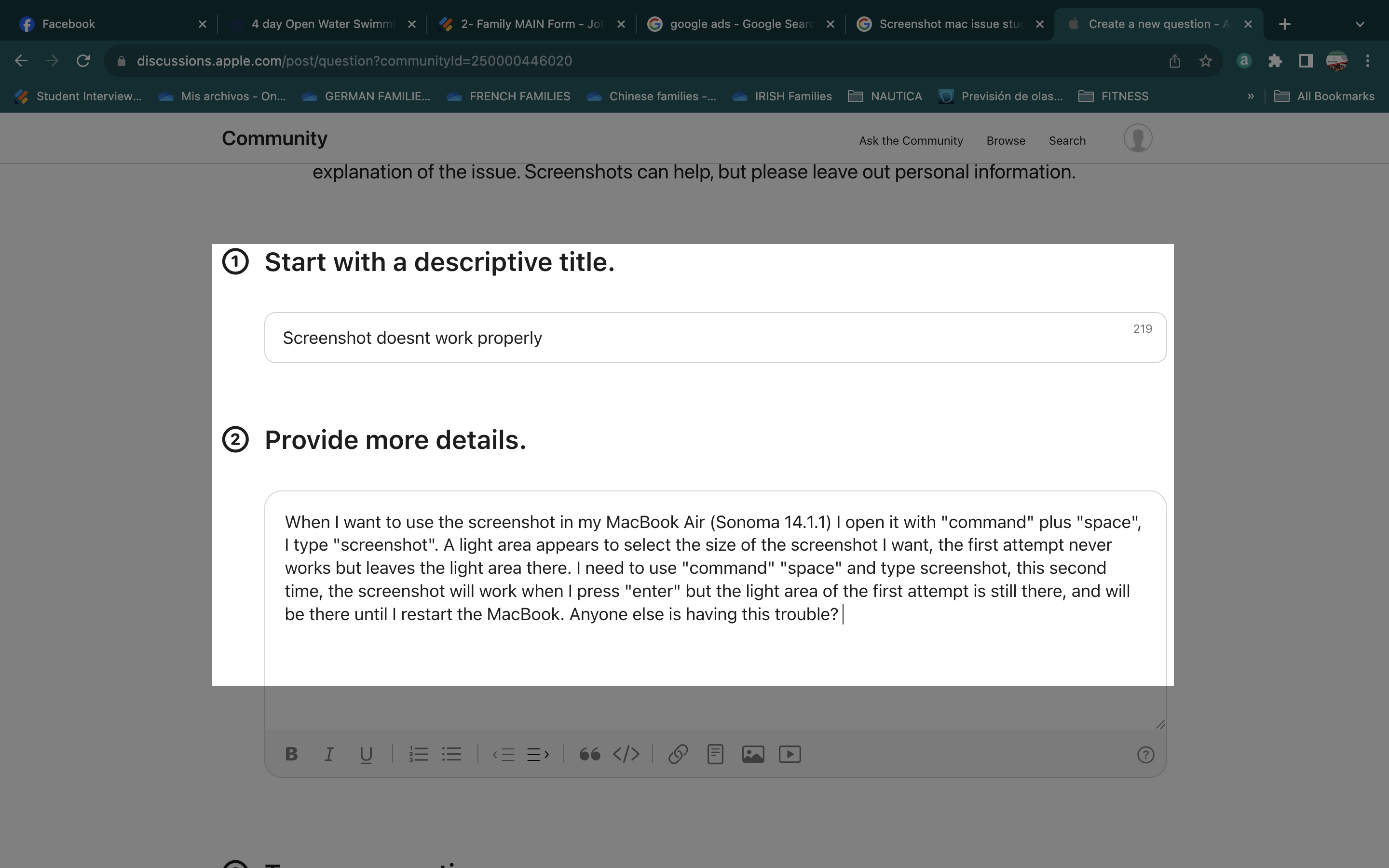 When I want to use the screenshot in my MacBook Air (Sonoma 14.1.1) I open it with "command" plus "space", I type "screenshot". A light area appears to select the size of the screenshot I want, the first attempt never works but leaves the light area there. I need to use "command" "space" and type screenshot, this second time, the screenshot will work when I press "enter" but the light area of the first attempt is still there, and will be there until I restart the MacBook. Anyone else is having this trouble?