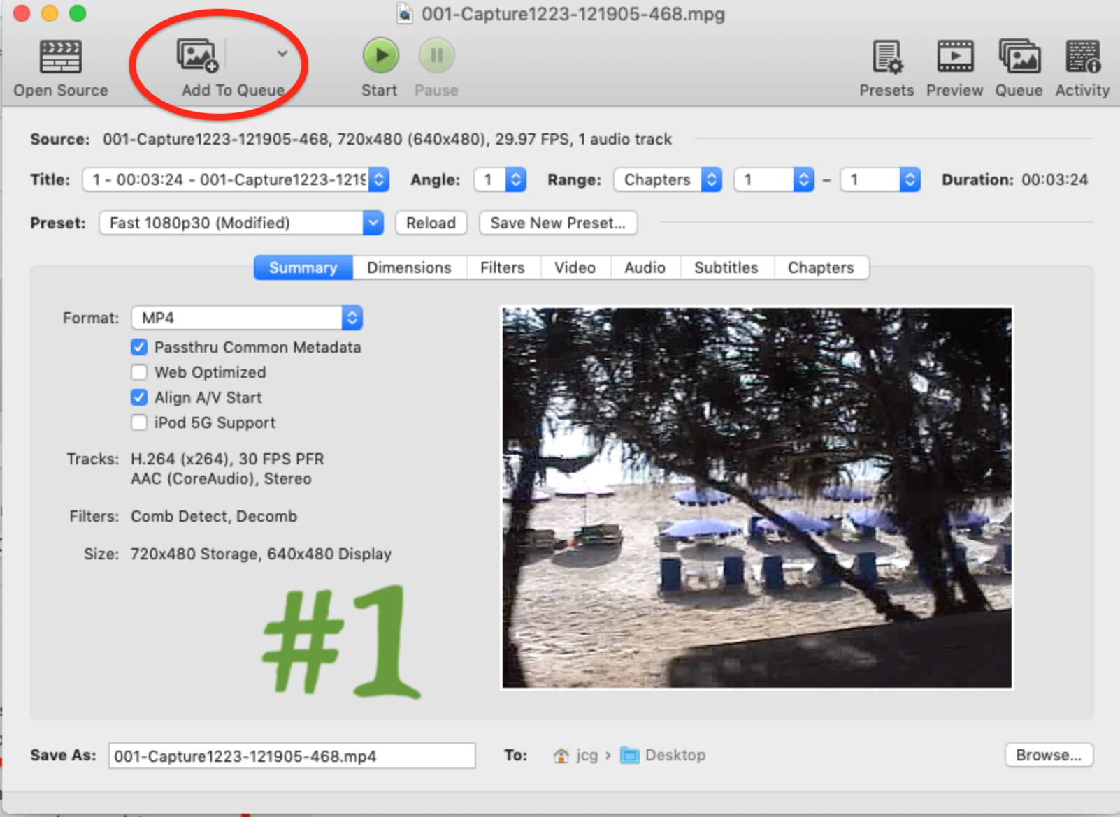 I was able to use Handbrake by using desktop as the destination. When I dragged the video to the desktop, as you stated, and Clicked on encode the file, that file did not work..it there is audio but the video is only a single frame. not sure why...regardless, I do have another question about Handbrake, How do I Queue up all the videos rather than having to do one at a time? I looked on youtube for tutorial and I see that they are different format versions of Handbrake...they do not help with how to queue more than one video...do you know how? Thank so below is my version, ... and #2 and #3 are the versions that I see on youtube that show how to queue more than one video...you can see mine does not have the tool bar at top as in #2 and #3 which they use to load a queue
