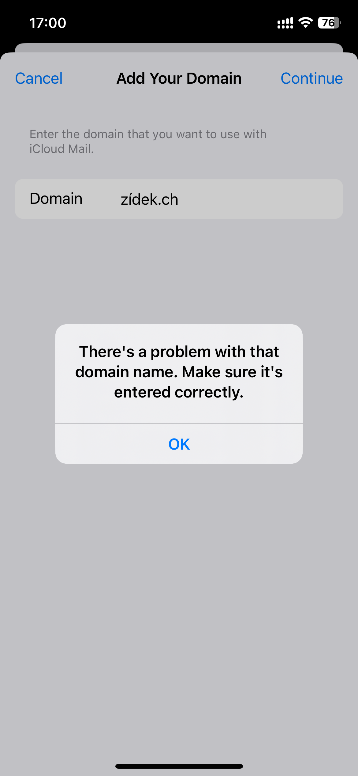 I have a IDN format dns domain with the í character in. When I try to add it as a new custom email domain in icloud, it keeps failing with the message: “There's a problem with that domain name. Make sure it's entered correctly.”