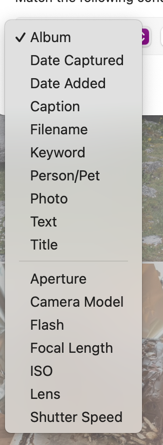 A Smart Album is a selection created by the app, consisting of photographs that meet criteria you decide. So, you can elect between any of the below: