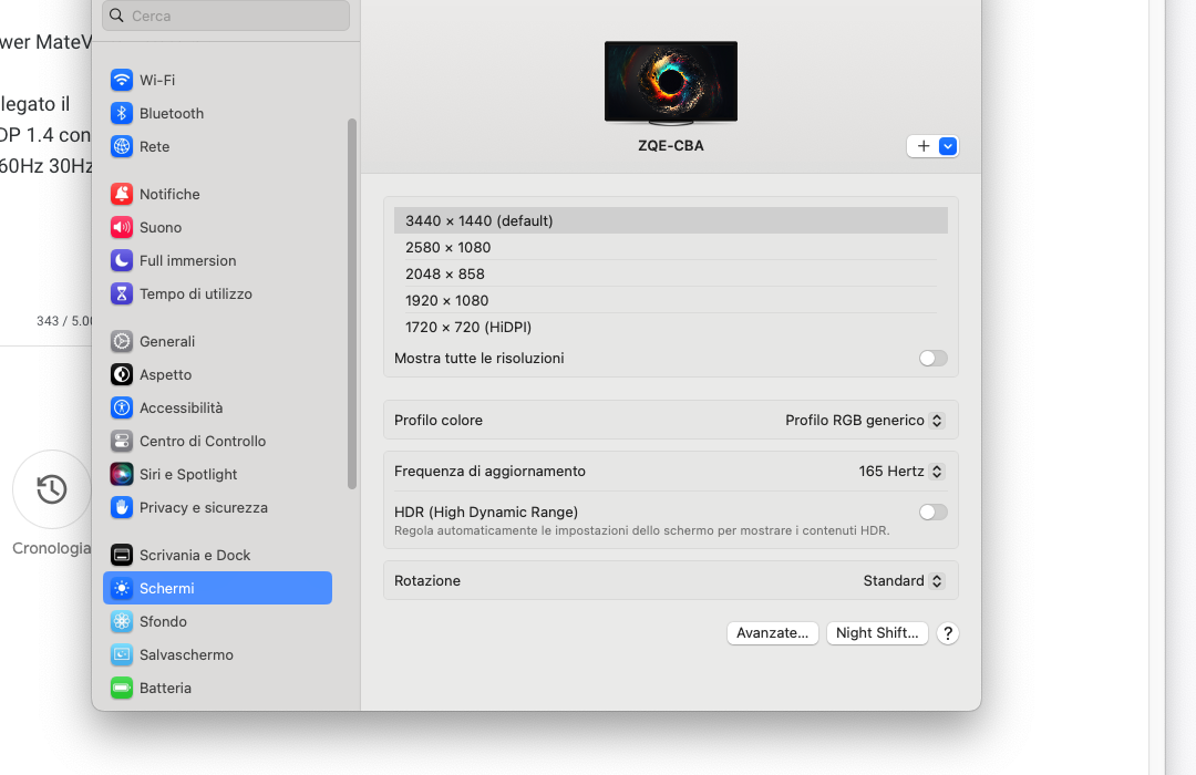 I have a MacBook Air 15 M2 connected to a Huawei MateView GT 34 monitor (resolution 3440x1440 - 165hz - 109ppi - 21:9 format - WQHD.