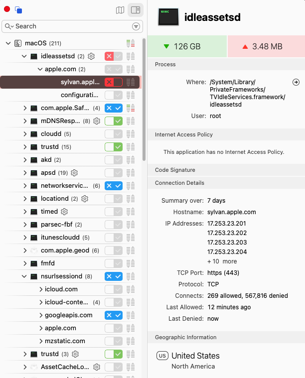 I blocked downloads from sylvan.apple.com specifically. Screen grab attached: for some time (how long ?) idleassetsd has pulled down 126GBytes from sylvan.apple.com. For comparison, the process nsurlsessiond has only done 5GB).