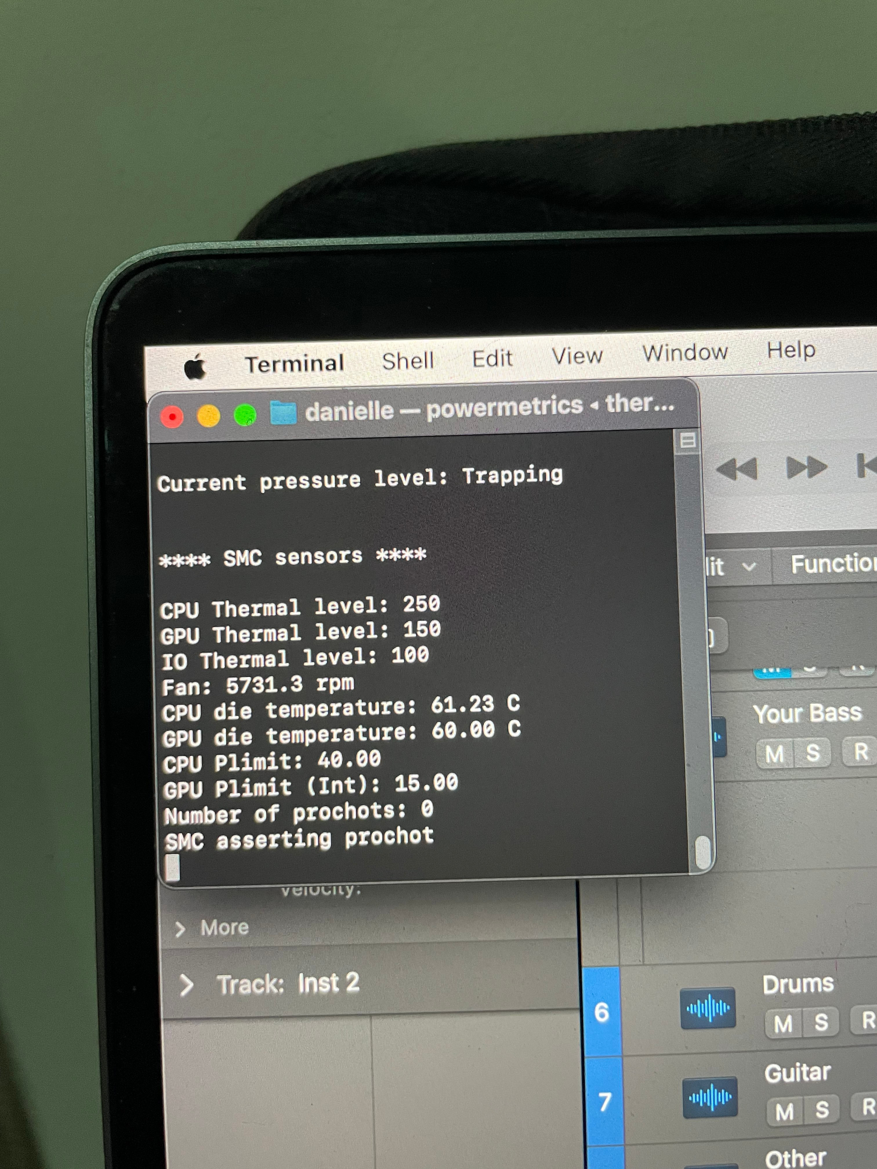 Things contributing: Firefox with a bunch of tabs, some IO: midi controller, synth, audio interface, being routed through my computer and not directly. It's all going through a cheap hub on one side of the Macbook, which I know is not ideal. Also have Messenger and Moises running.