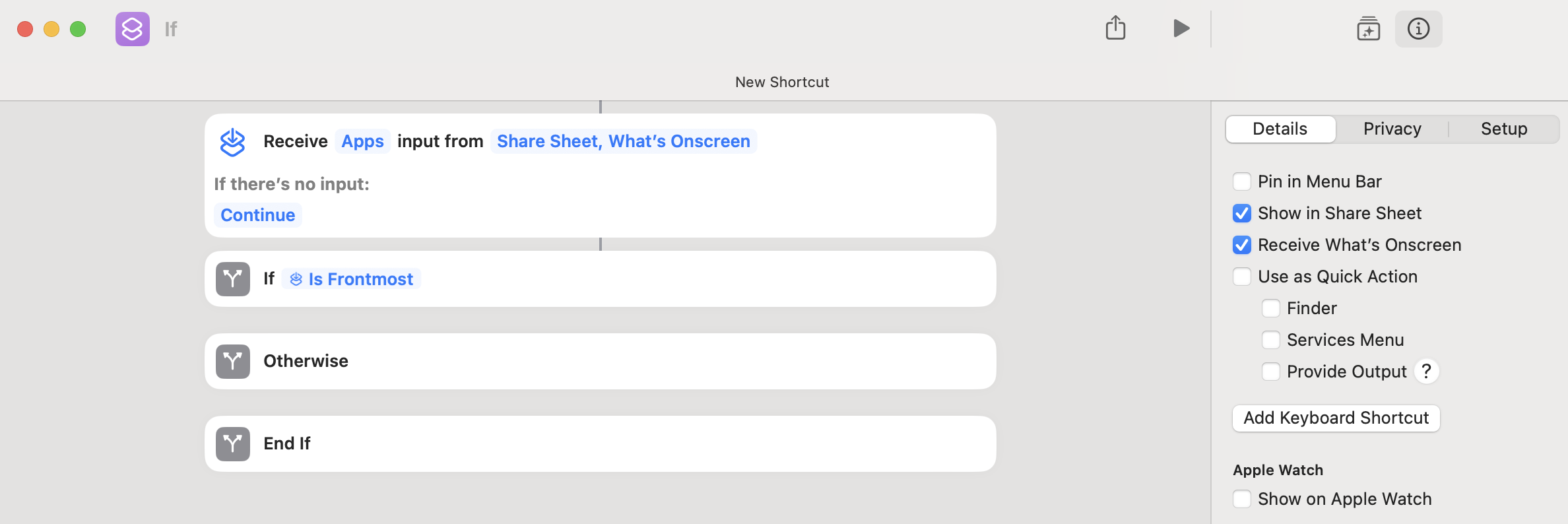 I am trying to create a shortcut that does different things depending on which app is frontmost. I have found the "Is Frontmost" variable in the App category of shortcut inputs. When I place it in an "If" block however, I am unable to enter a variable to compare the frontmost app to. How do I do this?