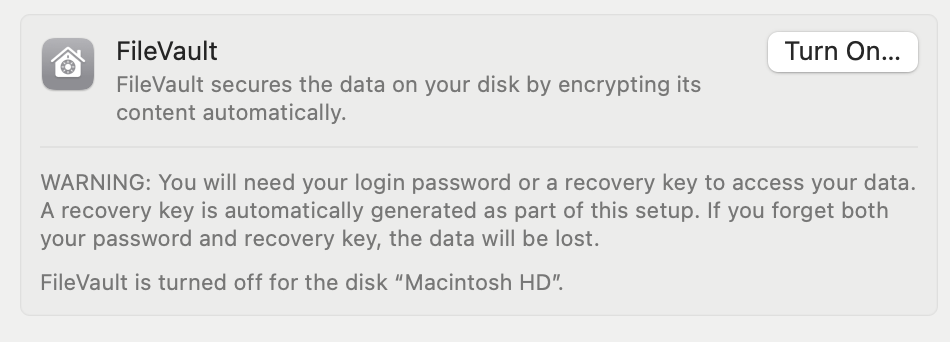 also from the Finder Help Menu: macOS User Guide "If you have a Mac with Apple silicon or an Apple T2 Security Chip, your data is encrypted automatically. Turning on FileVault provides an extra layer of security by keeping someone from decrypting or getting access to your data without entering your login password. If you use a Mac that doesn’t have Apple silicon or the T2 chip, you need to turn on FileVault to encrypt your data."