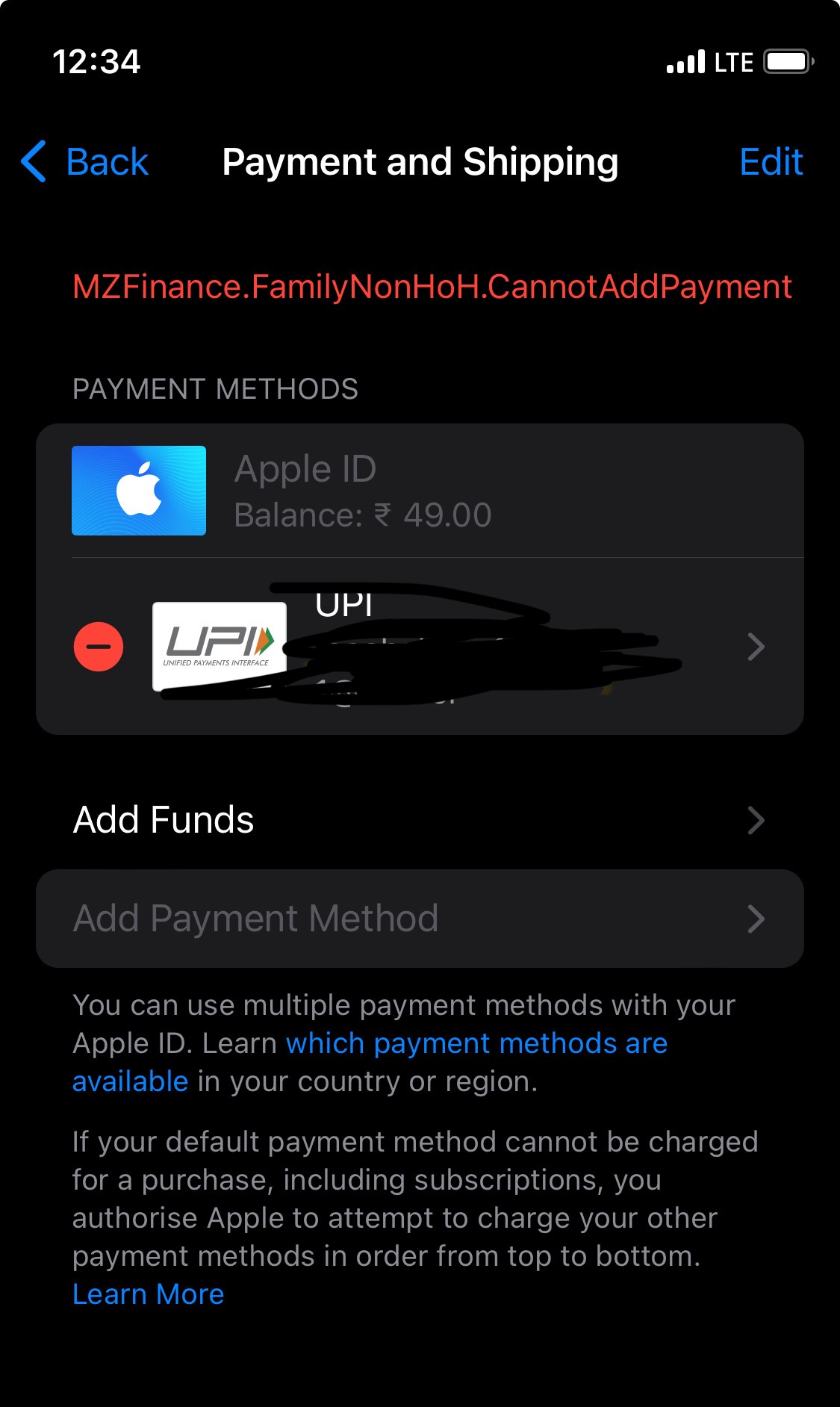 I am trying to add a New Payment method to my Apple ID in India, but unable to do so. Also, I am not able to delete the added payment method.