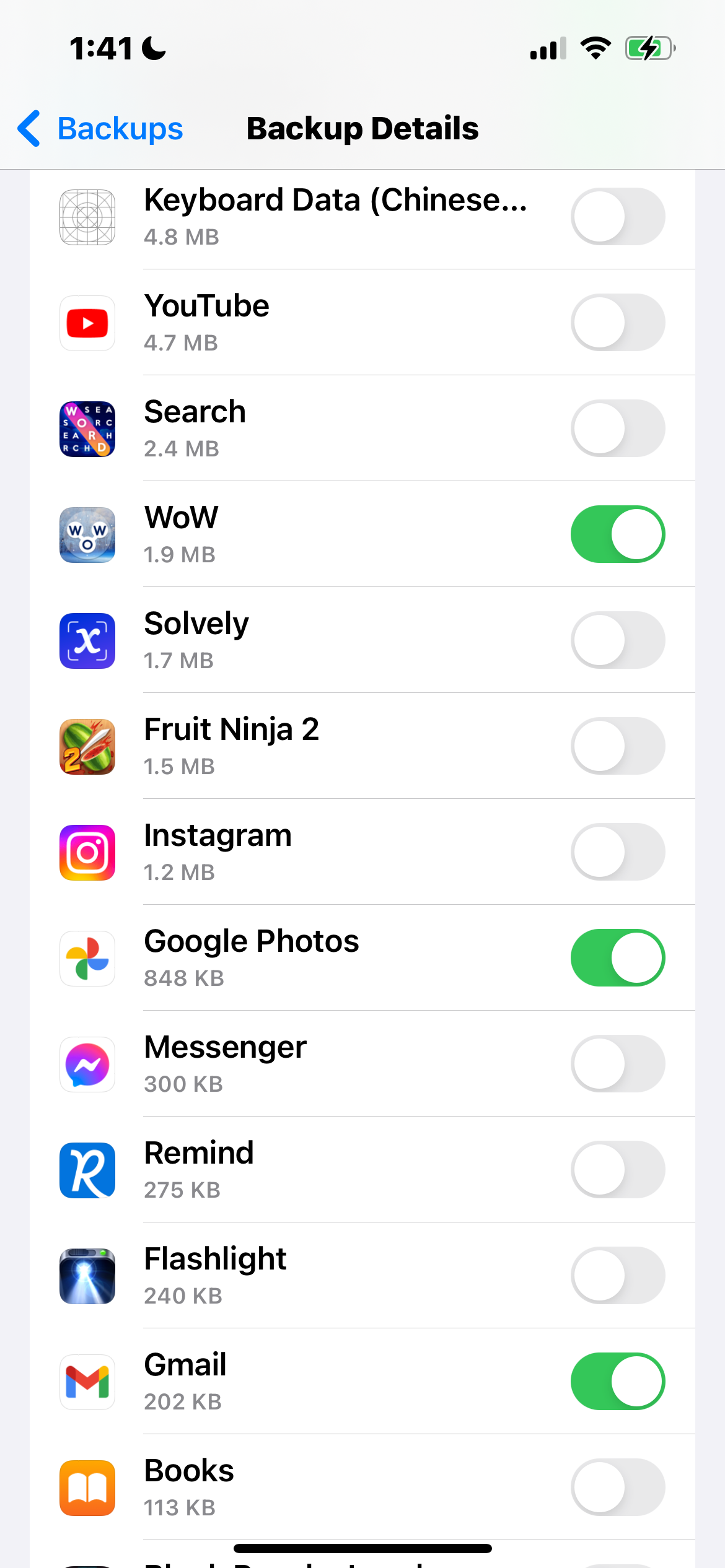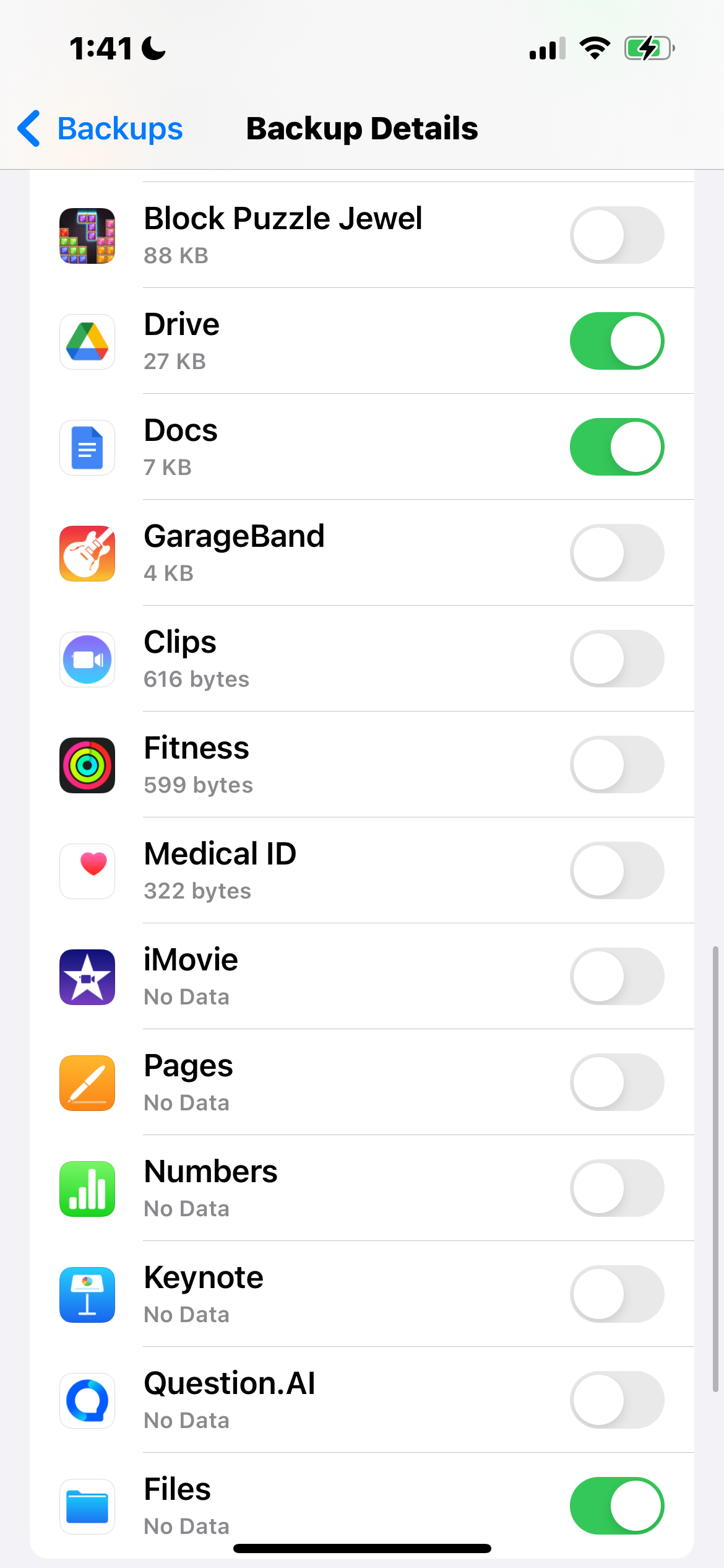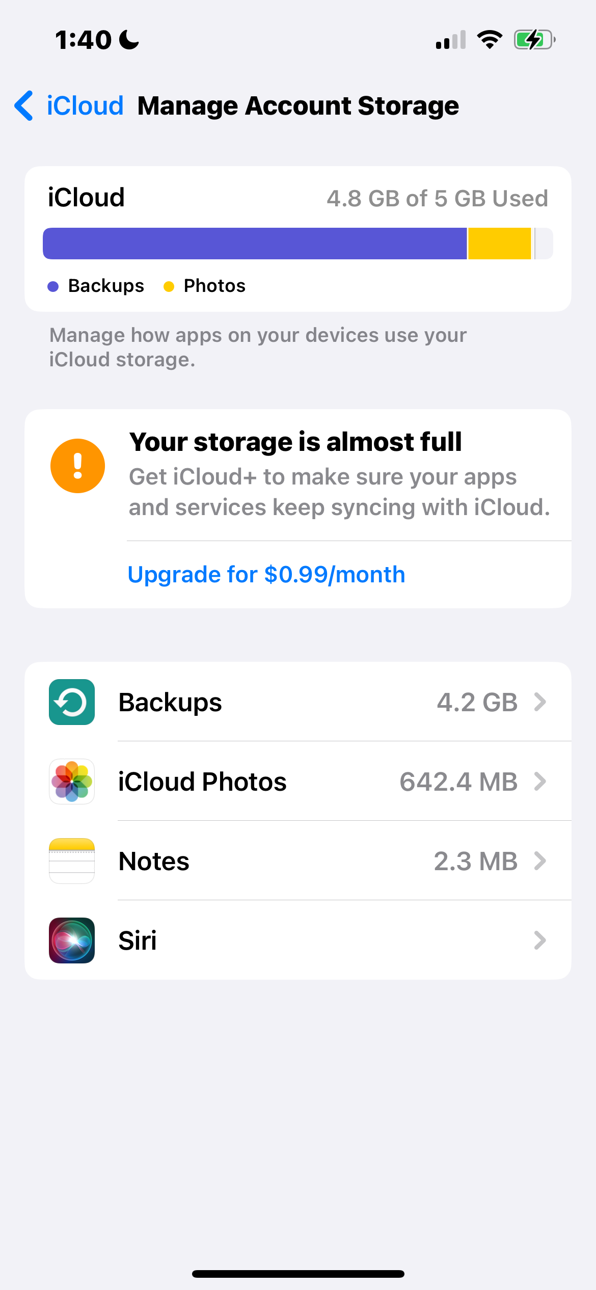 Hello! I have an iPhone 13, and it’s my first and only iPhone and first and only product with iCloud. My iCloud Drive has 0KB. After deleting most of my iMessage conversations, hundreds of photos even from the recently deleted section (leaving only 155 and 16 videos), deleting almost all my apps, and turning off backup data for almost all remaining apps, I still have 4.8/5 GB full. 4.2 GB of that is from my only backup file from 7 months ago (around when I first got this phone). I went to settings>apple ID>iCloud>manage account storage>backups, and that is where I see my singular backup that says it’s for this iPhone. I went into the backup details and tapped the switch that turns off backups and deletes iCloud data for many of my apps. Still, it did nothing to reduce the amount of storage my backup is taking up. I even updated my phone. What’s going on here?
