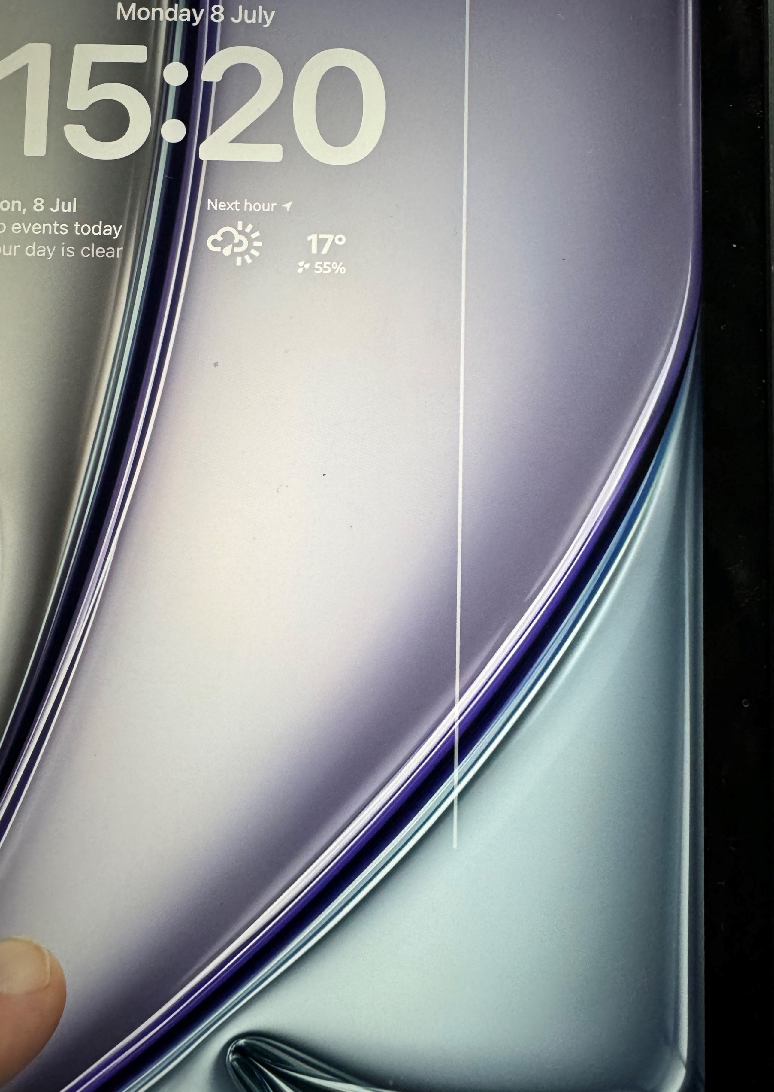 On a new iPad Pro 11 m2, when swipe up from bottom of lock screen, to unlock device, a white vertical line appears. Apple replaced with a new ipad and the replacement device does the exact same thing. You can see the lines in a screenshot, I believe that means a possible software issue. Have tried changing wallpapers and resetting device, and line still appears. Also line is sometimes black (seems dependant on wallpaper). Lines do not appear on any home page or within any app. Any ideas please?