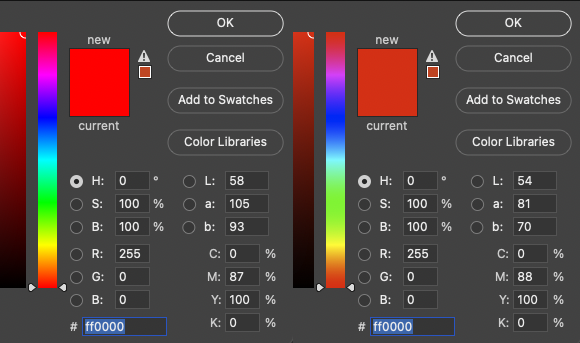 But that's also not unexpected. The iPad is using a small RGB space for the display. In the opposite effect of stretching color out, the iPad can't display the richest red beyond a certain point in Lab, so everything past the iPad's 255,0,0 point gets squished down to the same/nearest color it can display.