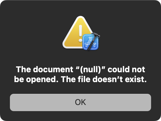 Recent files are no longer listed (as they were in Ventura) when I press the dock icon, my preferred way to open projects. In Xcode's File > Open Recent menu, there is a list of blank items where the files should be, and when I click on one, I get the this dialog informing me that the document (null) could not be opened because it does not exist.
