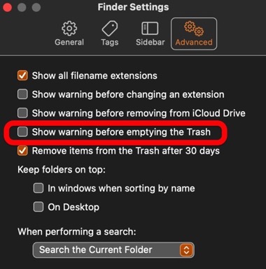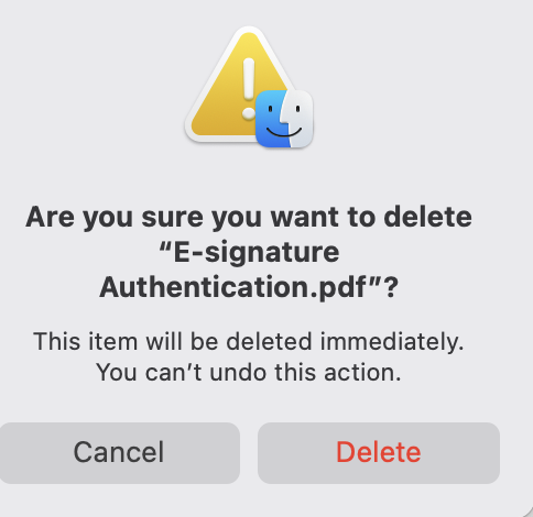 Since updating to SONOMA on my iMac, anytime I go to move a file on my desktop to the trash a Finder window pops up and asks "Are you sure you want to delete __file name__ file? This item will be deleted immediately. You cannot undo this action." How do I make this stop...so frustrating. I've gone to Finder>Settings>Advanced but checking or unchecking any of the boxes does not fix this issue...HELP!!