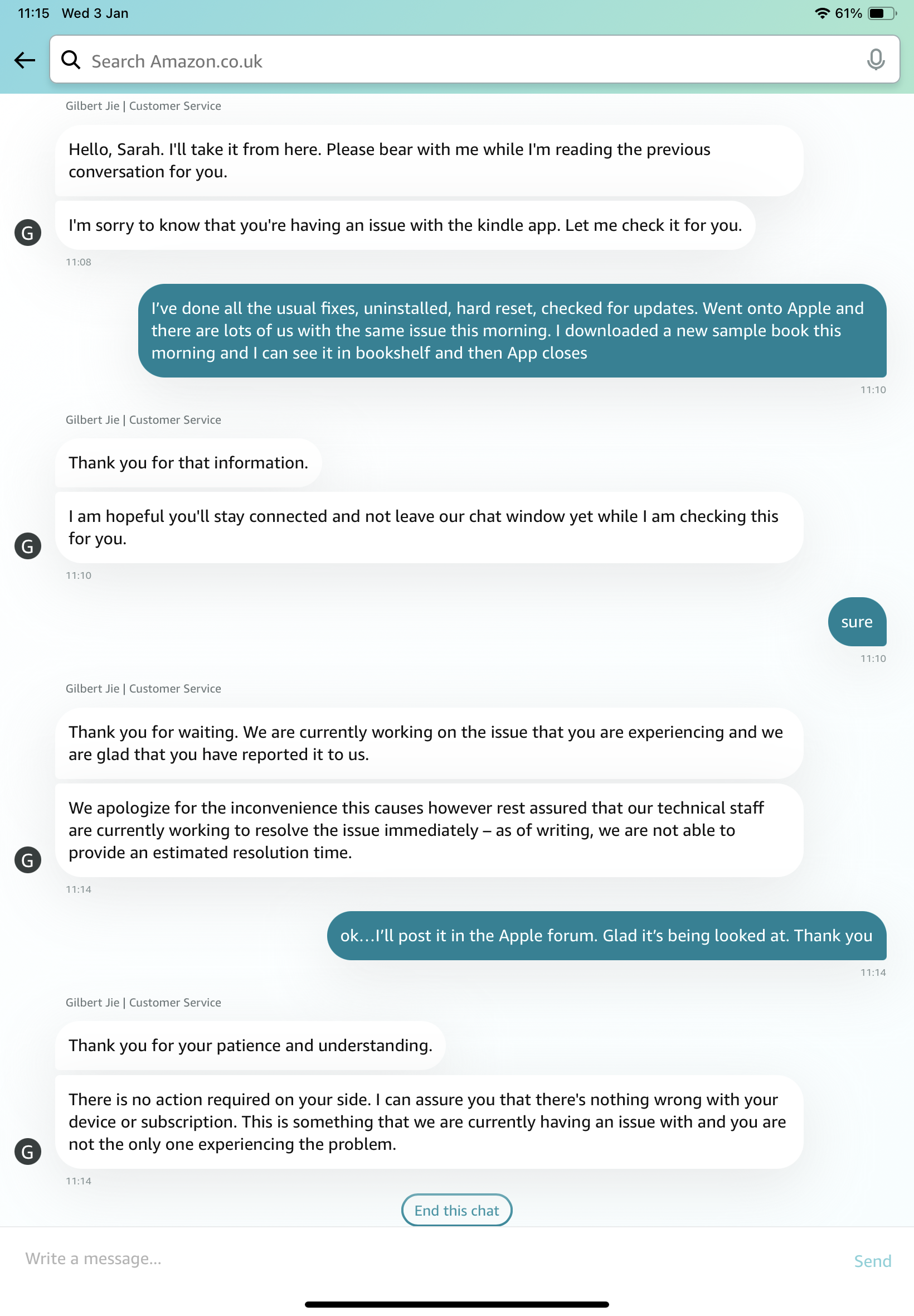 If the issue still persists, I suggest that you contact Kindle developer/support team and ask them:--> How to contact an app developer - Apple Support