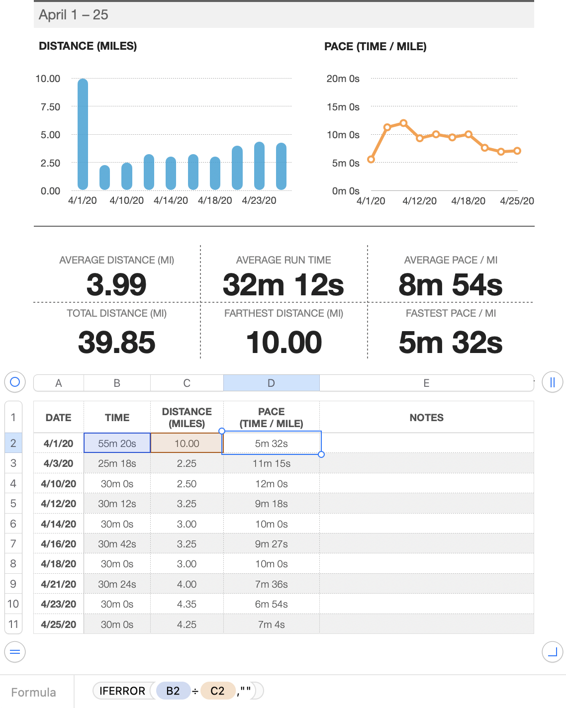 You enter the date in column A, time in B, and distance in C. It calculates the pace, and produces all those nice summary statistics and charts.