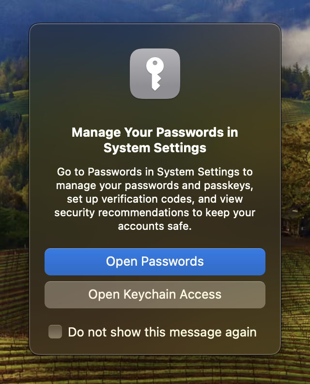 Hi, on a new MacOS user account when you go to open Keychain Access to look up a password, the system gives you the option to Open Keychain Access or to Open Passwords - the newer, easier (imo) option in Sys Preferences.