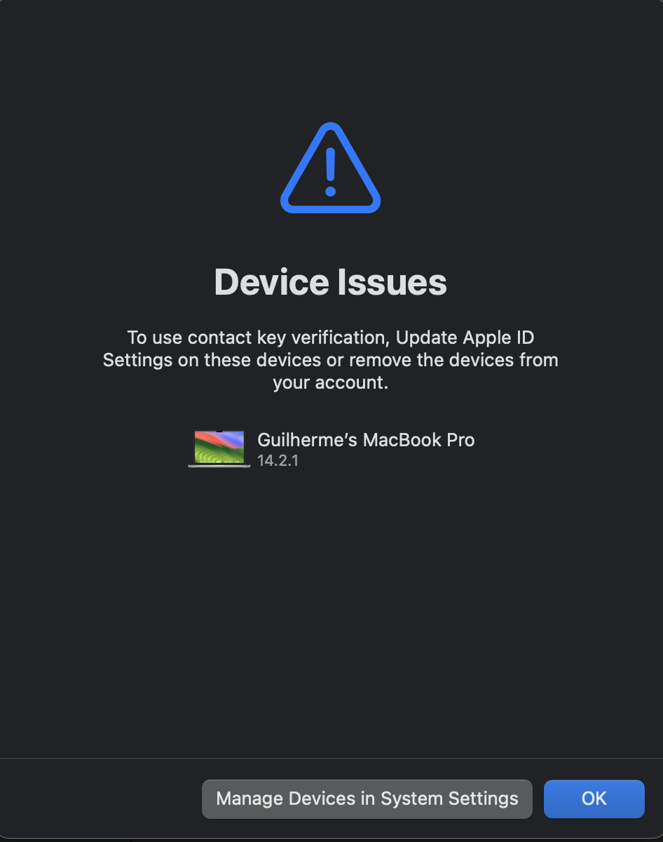 I'm trying to activate the Contact Key Verification, but it keeps saying that I need to update the Apple ID Settings in my MacBook, which is updated. Can someone help me with that?