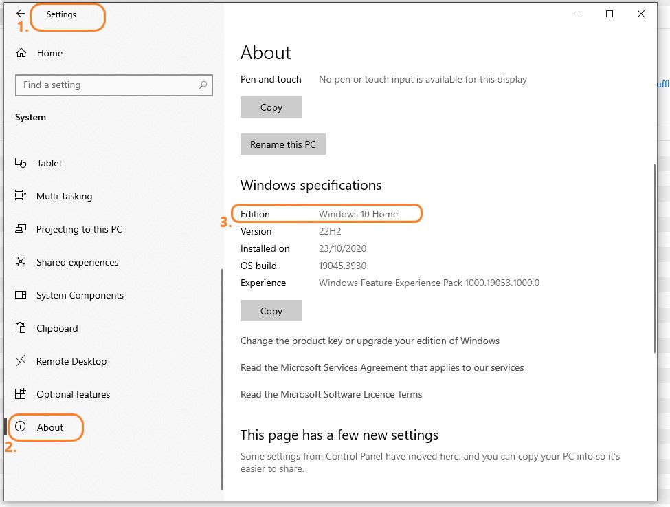 You can check your Windows version in your computer's Settings. Go to the Windows Start button, Settings (the gear icon)/System/About>Edition. That's Settings (1.), About (2.) and Edition (3.):