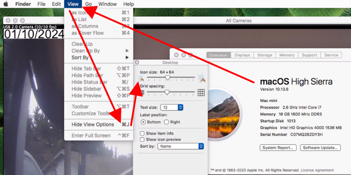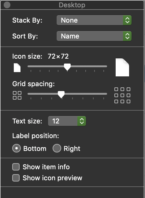 Click on the Desktop, then CMD+j, or Finder's Menu>View>Show View Options...