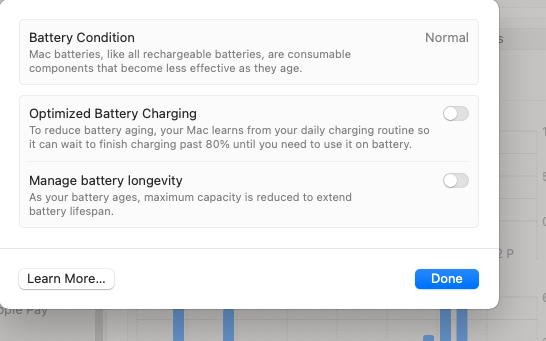 After a recent upgrade my MacBook only charges to 80%. If I am going to be remote I have to remember to click "Charge to Full Now" a couple of hours before I leave home. I checked the settings and my Optimized Charge is set to off. With this feature turned off, it should always charge to 100%. Its a really crappy experience if I take it on the road and after a couple of hours of Zoom calls, I have almost no power. Doesn't Apple QA these supposed "Improvements"?