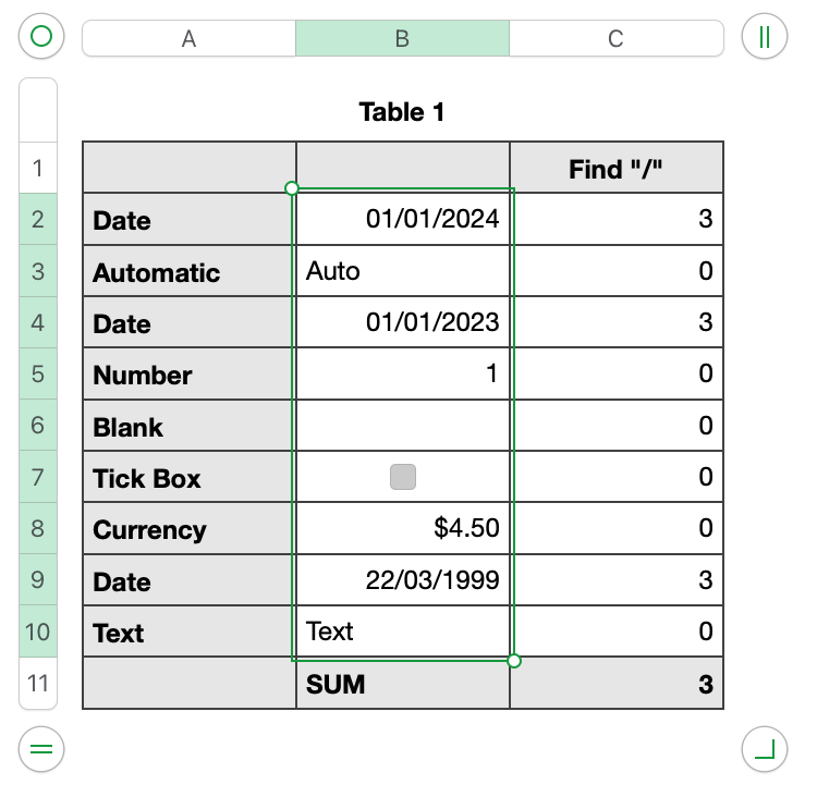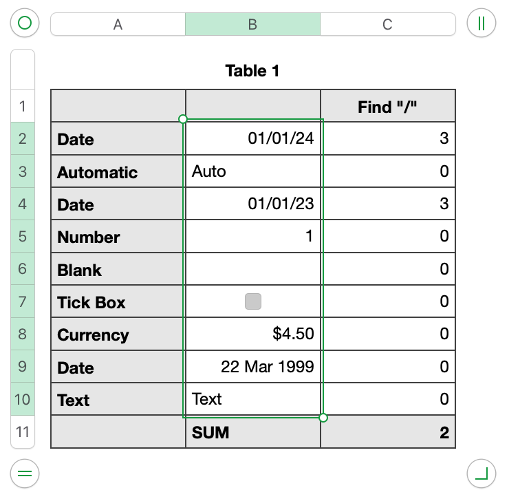 No problem. Select all the Body cells in column B and Format Panel > Cell Data Format > Date & Time > choose a Date format that displays a slash. Numbers will not mess with the cells that are not a Date.