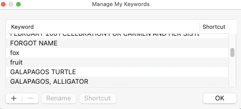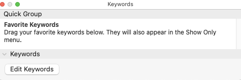 Just to be sure, have you tried to restart Photos or the system? and have you already tried to toggle the disclosure triangle to the left of "keywords" to reveal or hid the keywords?