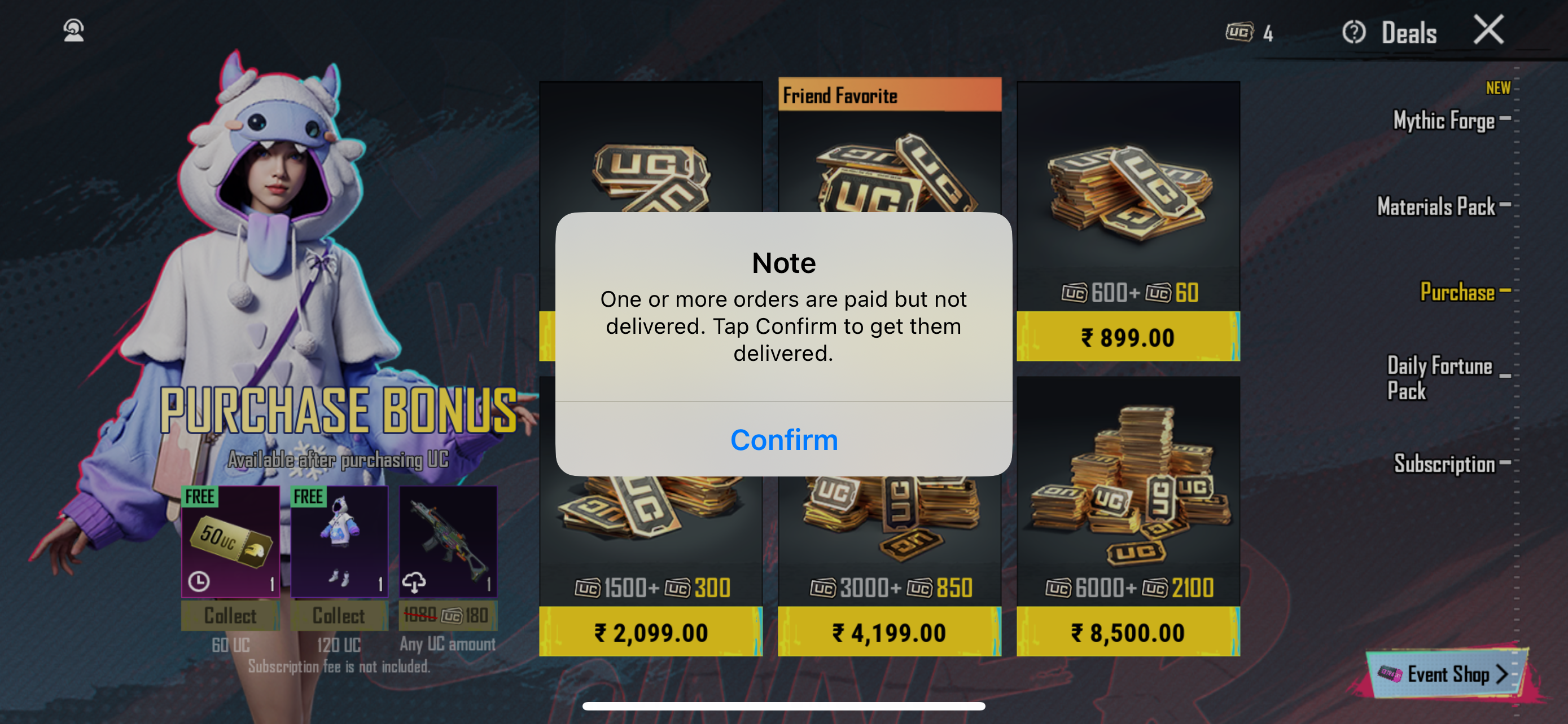 I have purchased UC (game currency) in BGMI and the payment is done,the money got debited from my bank account.The problem is i did not get the UC in my BGMI ID.A message appears in the app that the order has been paid but not delivered,tap confirm to deliver but UC does not get credited after tapping confirm.I badly need help,i’ve contacted apple support but they didnot give any assurity and game developer is not responding since 2 days.