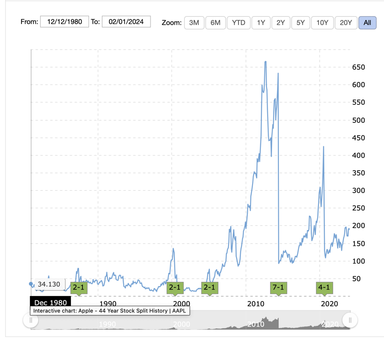 I know that I can use the "STOCKH" function to get the price at which APPL IPO'd at (12/12/1980) which returns "$0.13". And I can use STOCK to get a current stock price of AAPL = $182.68. But this returns a gain of approx. 142385.03% not the 56,615.65% mentioned above.