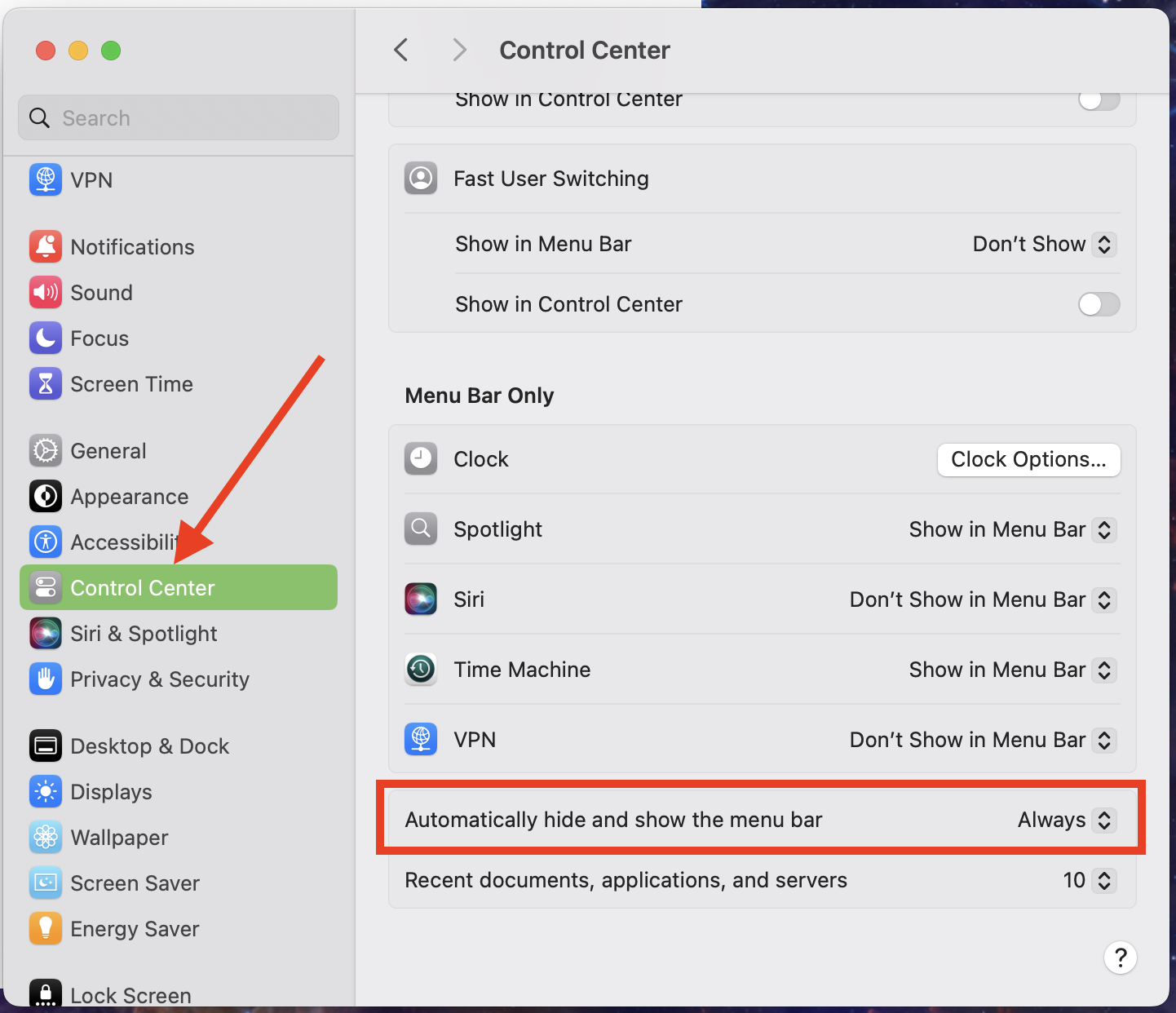 and then go into System Settings > Control Center in the "menubar only" section and see if it is set to hide itself.