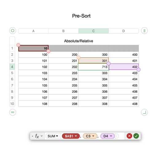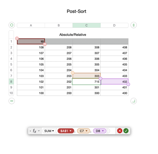 My understanding is that relative and absolute references in spreadsheets control the behavior when filling or copying a formula, not the behavior during a sort.