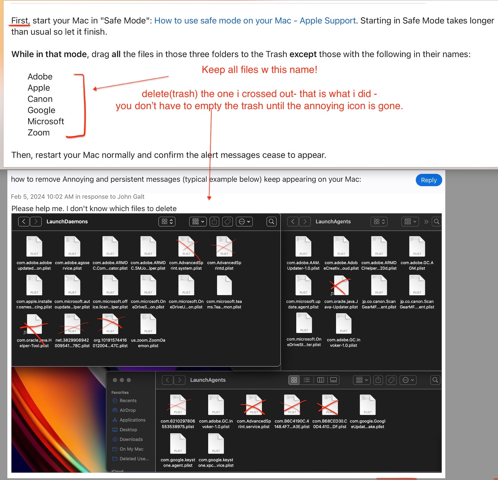 Then, restart your Mac normally and confirm the alert messages cease to appear.