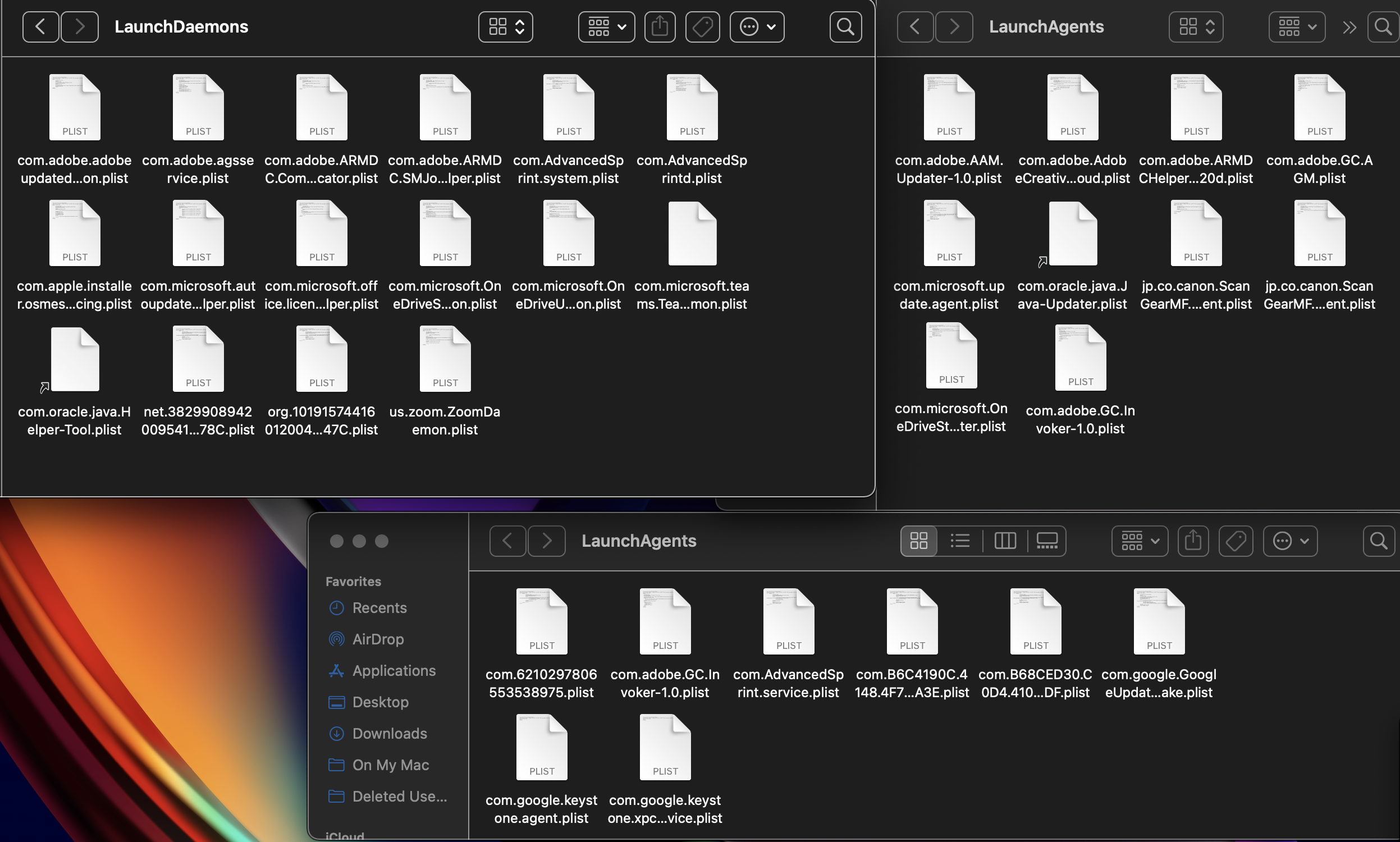 Now, in each of those three windows, select View > as List or other selection that shows that folder's complete contents, including complete file names. Modify the column widths if necessary. Expanding the window's overall width so as to encompass the file's modification dates will help also, so please endeavor to do that.