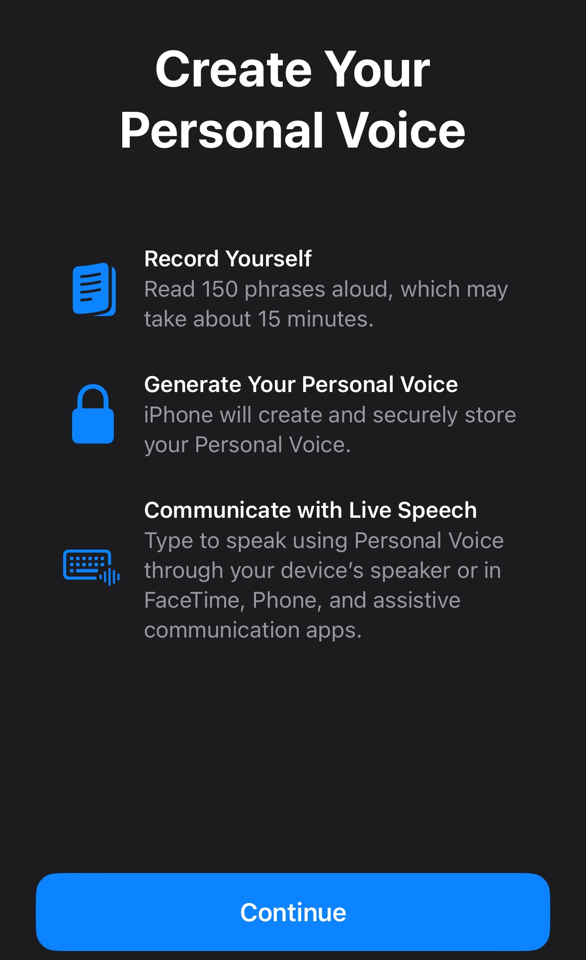As of right now, there is no option to use a pre-recorded audio because it’s set up to speak a series of 150 phrases during Personal Voice set up. I’ve added a screenshot of how it starts off just so you can see that. I think the dilemma is the prerecorded audio would have to be of you speaking each phrase which nobody knows what the random phrases are until they start doing them. When I set mine up, you say a phrase then it quickly moves to the next phrases back to back. The problem is your prerecorded audio doesn’t have those phrases.