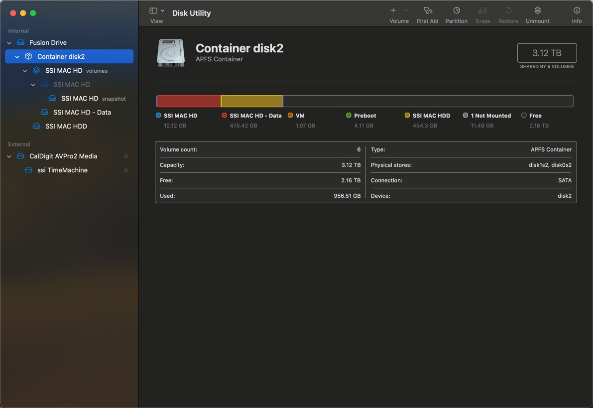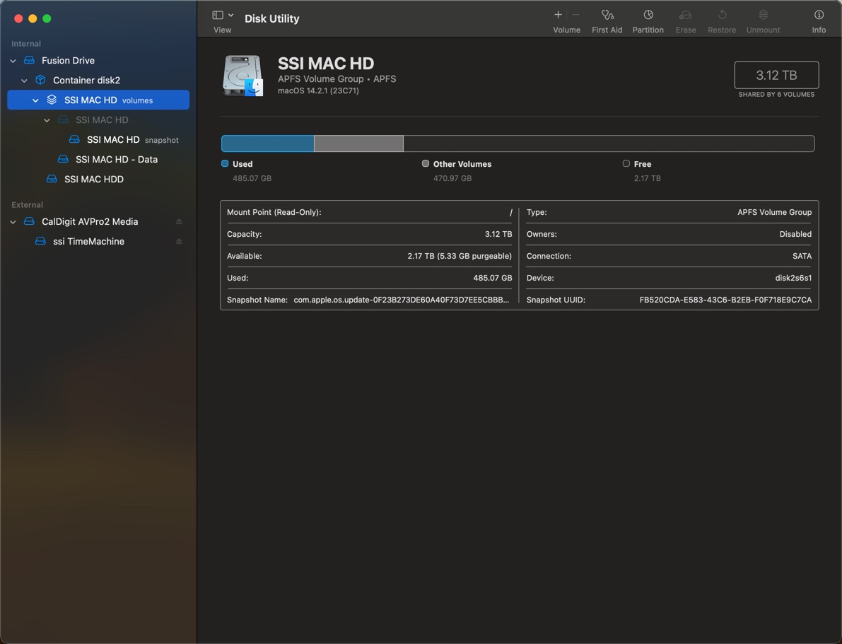 Recently upgraded from Mojave to Sonoma. Time machine complained about having duplicate volumes so I guess I renamed it to allow a backup. When I look at Disk Utility I see the old volume, which I think is called SSI_MAC_HDD -- although it seems to be larger and have more files than the other volume. Curious how to clean this up, ie what to remove or unmount etc and how to reconfigure TimeMachine?