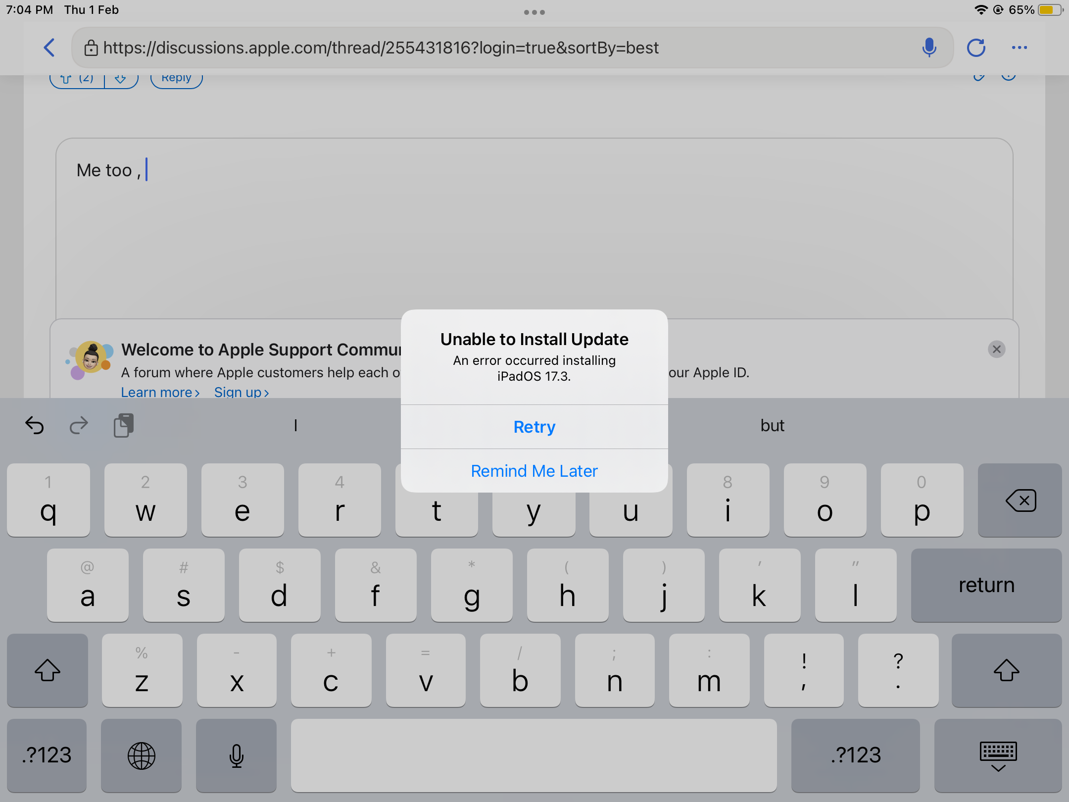 I’m having the same issue. I can’t update my ipadOS from 17.0.3 to 17.3.1. I can download and install the software but once it restarts the OS is still the same. Also, I already use iTunes to update or restore it but it says an error occured. Please help.