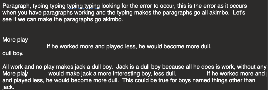 Importantly, the text itself is not changed, as can be seen if you just ignore it and keep typing. However, if you stop and try to select the text, it cannot be grabbed, since it's not really there. It is a visual corruption only, but when you don't know what you have written, it's hard to confirm what's, well, written.