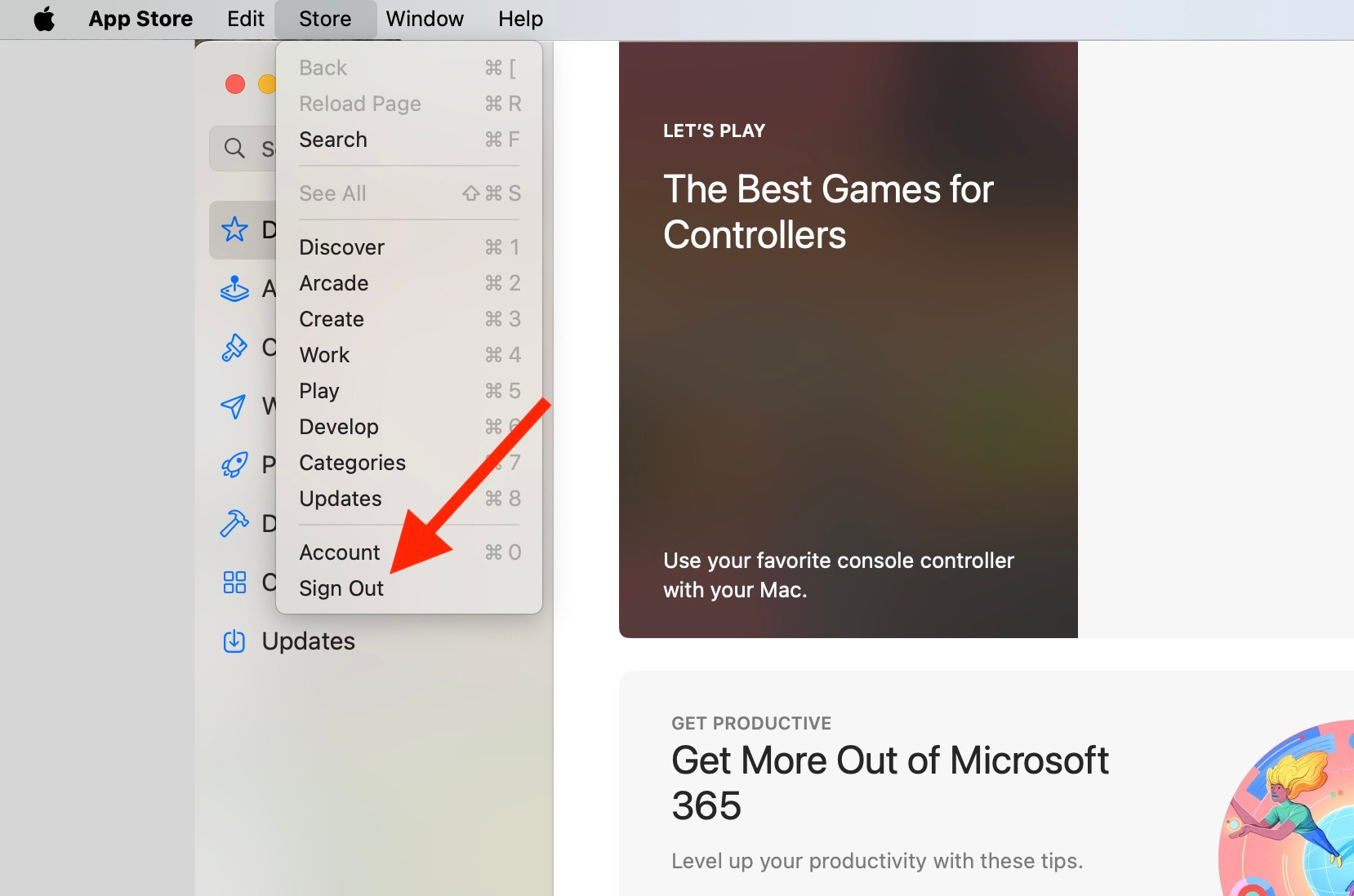 How do I log out of the App Store in MacOS Sonoma?