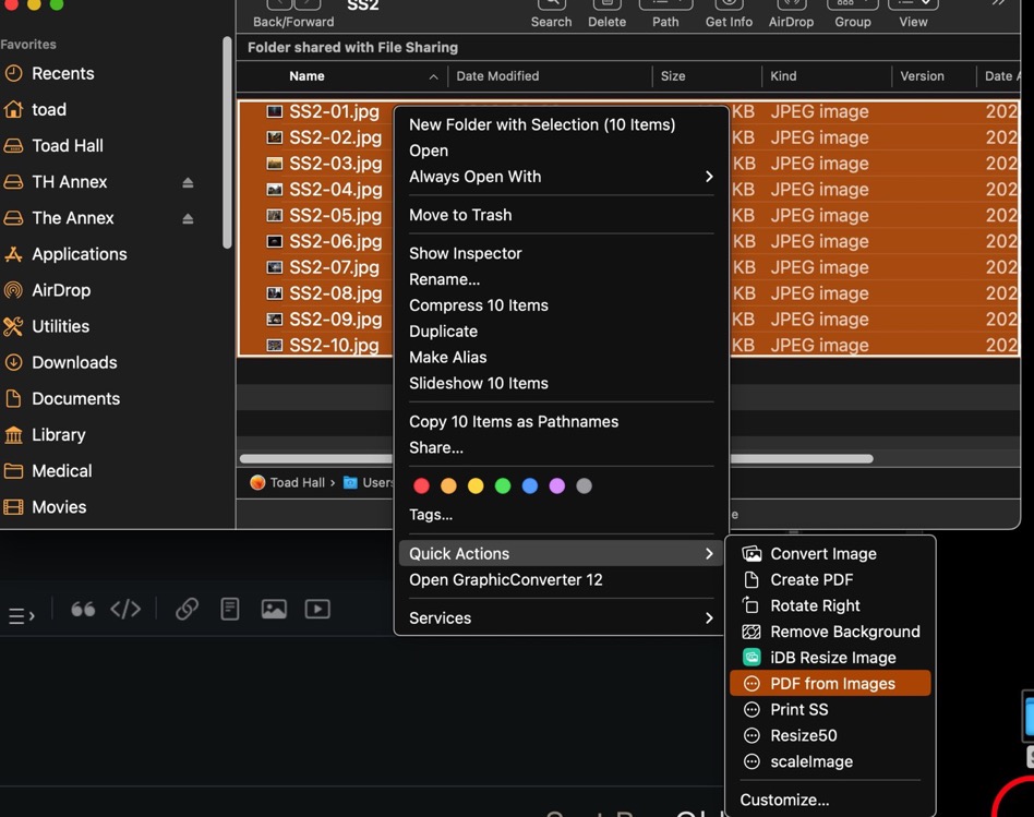 On my MacBook running Sonoma 14.3 I have a folder of JPG files that I need to convert to PDF.