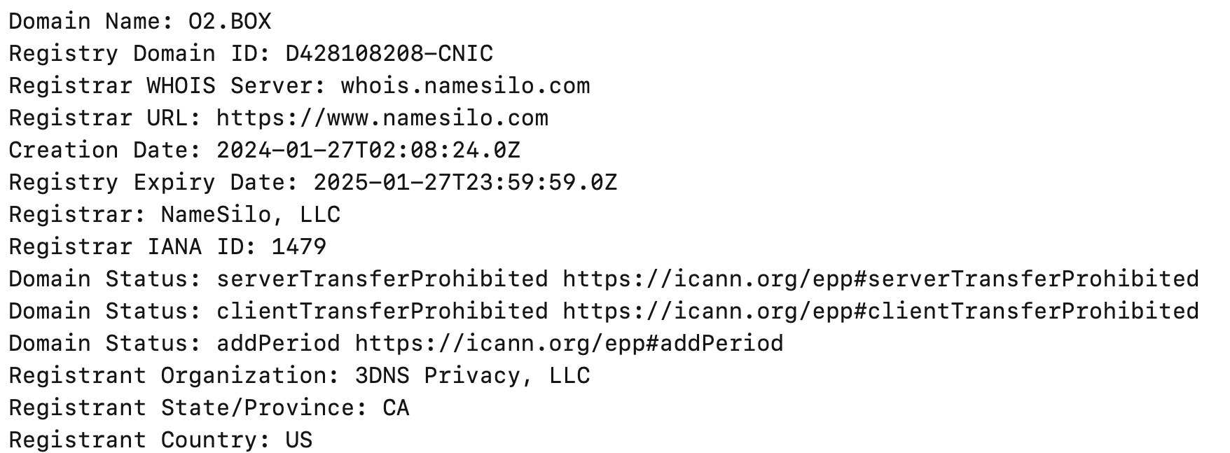 To give some background information, the WLAN router is provided by my ISP in Germany, O2 (Telefonica), and it has always been possible to access the settings interface of the router by entering “o2.box” or the IP address “192.168.1.1” in a web browser’s address line. Now, when I enter one of these, I will be sent to a website named o2.box which was registered on 2024-01-27 by some service called NameSilo LLC. All this is highly dubious.