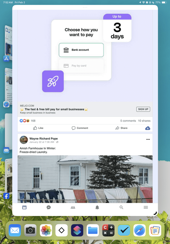 With Stage Manager disabled (arguably, this being the far more useful mode when using the iPad without a connected external monitor), you will see the established Full, Split and Slide-over views (accessible from the three-dot multitasking button that you'll see at top-centre of open App windows). In this mode, you will not see the re-sizing handle.