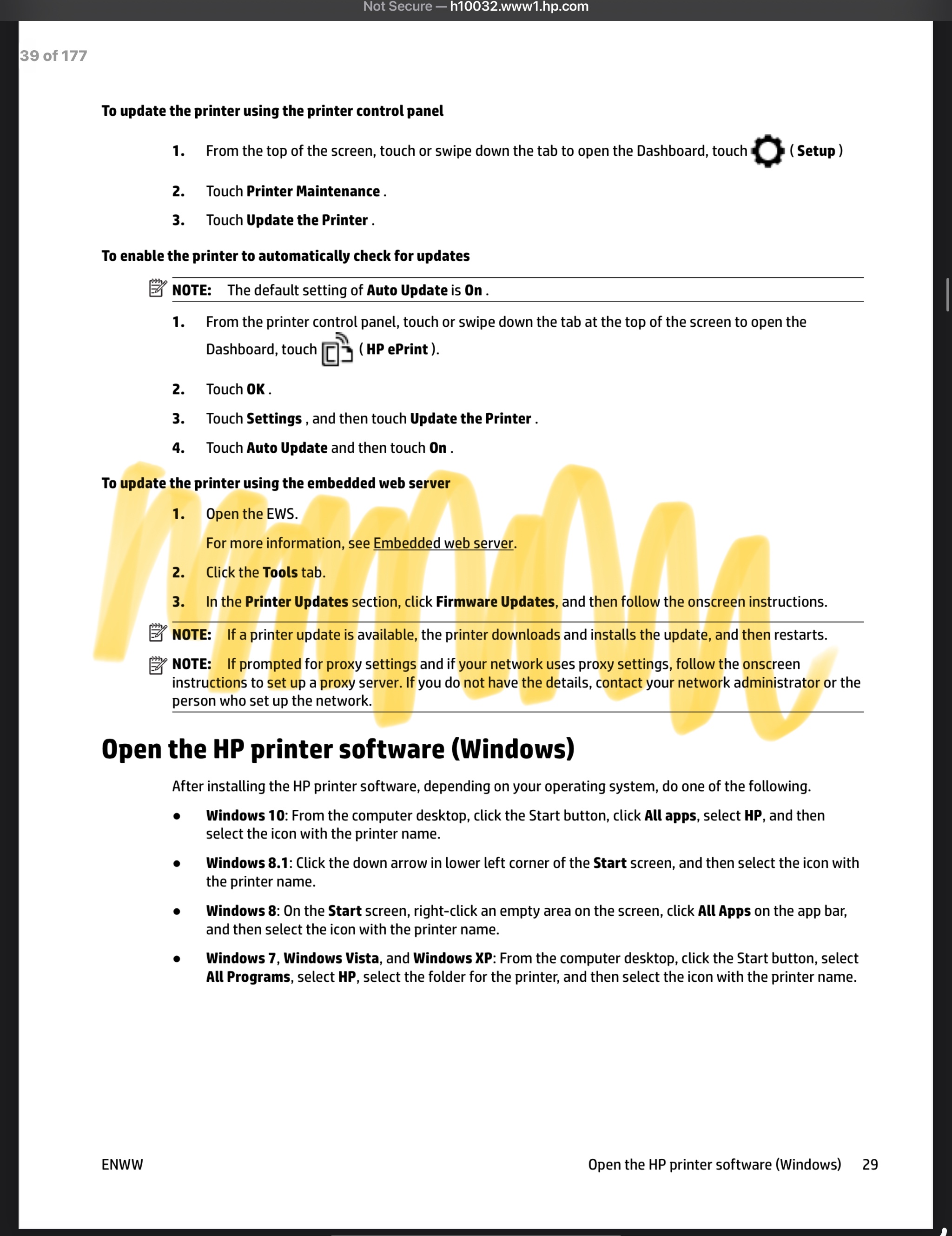 The section on page 29 (around firmware updates) that was applicable here. That seems to already be current, though. The embedded web server avoids having to deal with host drivers and settings, and also avoids dealing with the usually-tiny control panel on most printers.